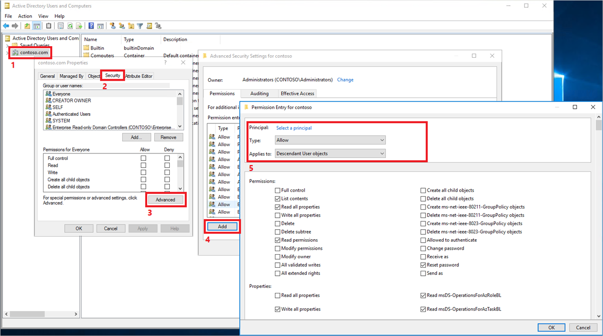 Als wachtwoorden voor sommige gebruikersaccounts niet worden teruggeschreven naar de on-premises directory, moet u ervoor zorgen dat overerving niet is uitgeschakeld voor het account in de on-premises AD DS-omgeving. Schrijfrechten voor wachtwoorden moeten worden toegepast op onderliggende objecten om deze functie correct te laten werken.