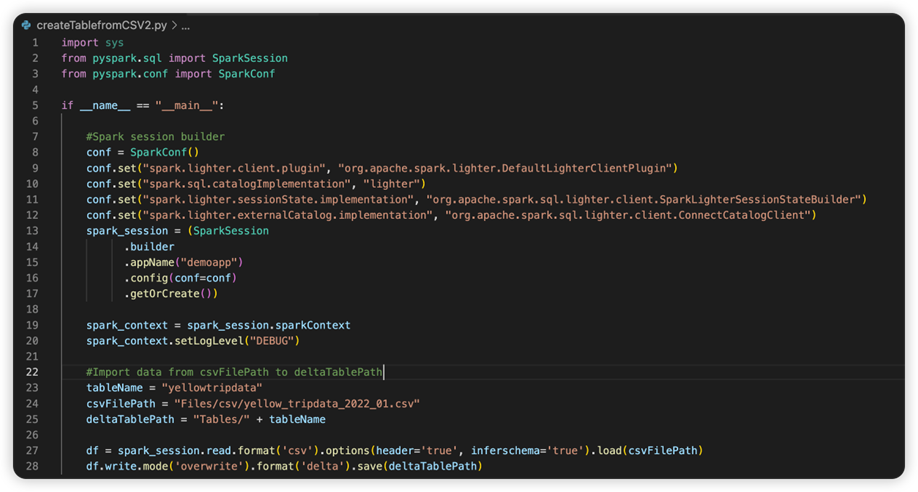 Het bestand met de naam sparkconf.py bevat een codefragment dat u moet toevoegen om het SparkConf-object in te stellen. Als u de externe foutopsporing wilt inschakelen, moet u ervoor zorgen dat het SparkConf-object juist is ingesteld. In de volgende afbeelding ziet u de oorspronkelijke versie van de broncode.