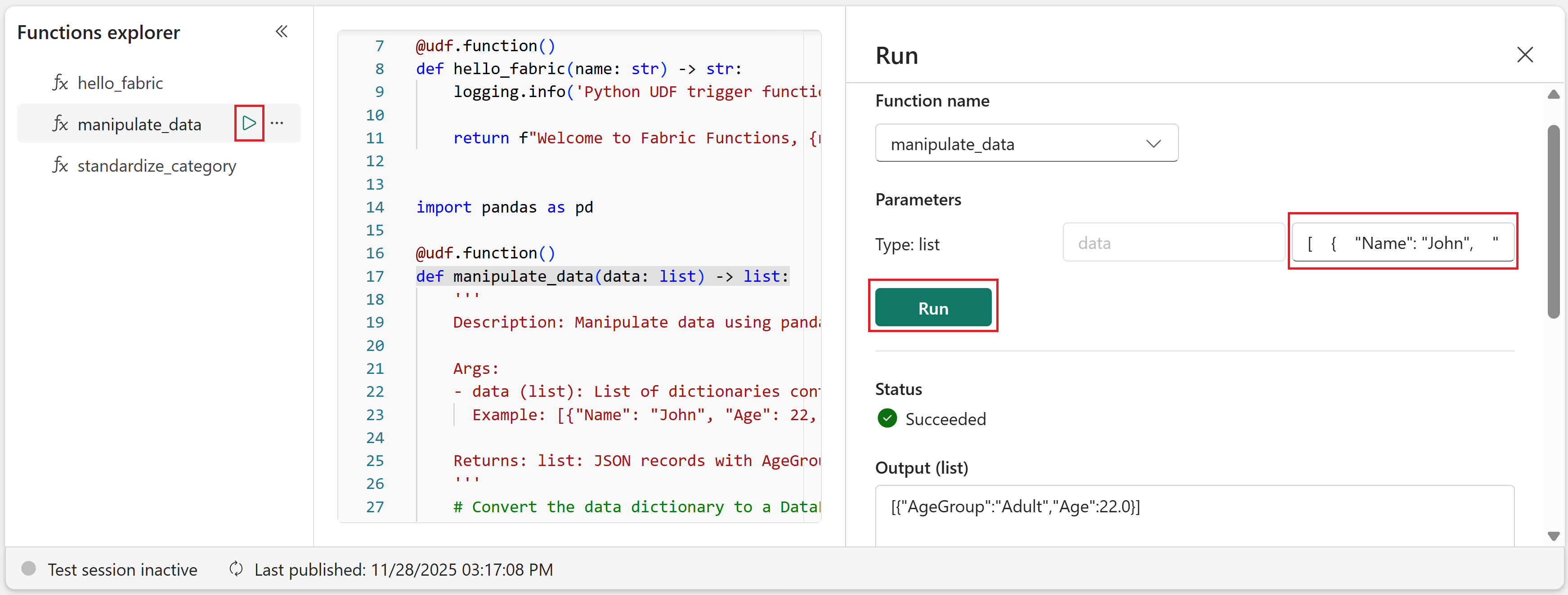 manipulate_datafunctie.Selecteer de knop Uitvoeren die wordt weergegeven wanneer u de muisaanwijzer over de functie beweegt.