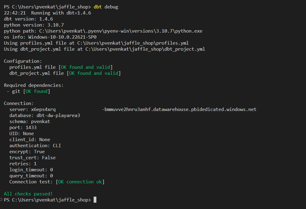 dbt debugin de Visual Studio Code-terminal.dbt debugAlle controles zijn geslaagd, wat betekent dat u uw magazijn kunt verbinden met behulp van de dbt-fabric-adapter vanuit het