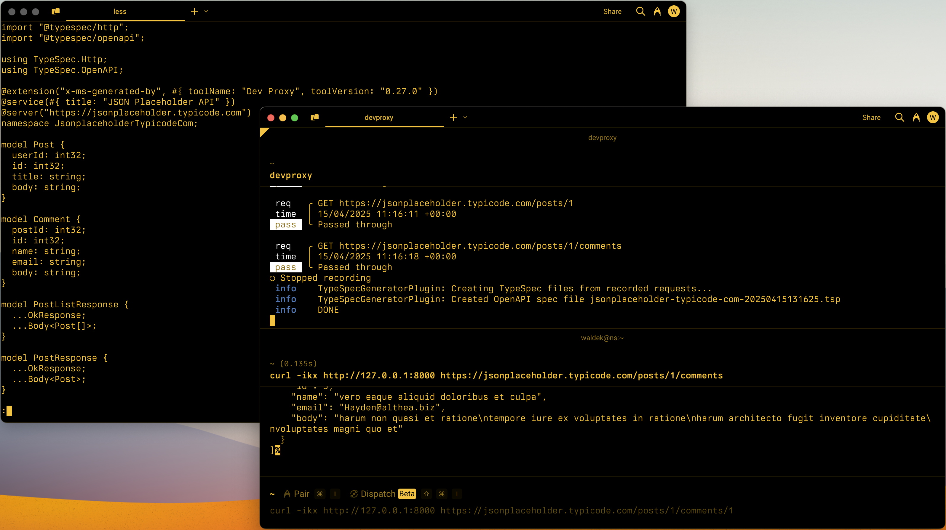 Met Dev Proxy kunt u een TypeSpec-bestand genereren op basis van de onderschepte API-aanvragen en -antwoorden. Met behulp van Dev Proxy kunt u snel een TypeSpec-bestand voor een bestaande API maken en profiteren van de hulpprogramma's die TypeSpec ondersteunen.