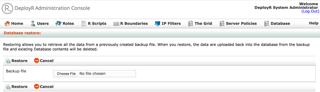 In that tab, click Restore DeployR Database. The Database restore page appears.