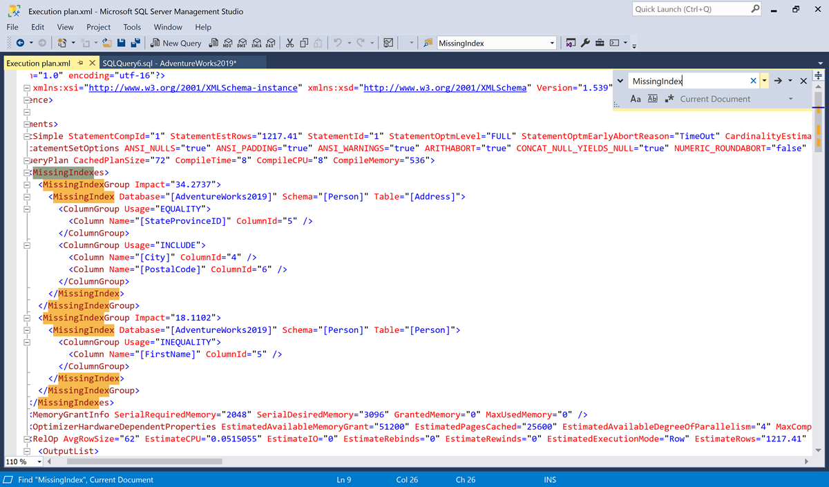Schermopname van de XML voor een uitvoeringsplan. Het dialoogvenster Zoeken is geopend en de term MissingIndex is gezocht in het document.