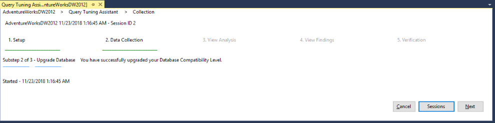Schermopname van QTA Stap 2 Substep 2: compatibiliteitsniveau van de database upgraden.