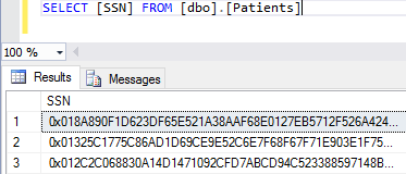 Ervan uitgaande dat SSN een versleutelde kolom in de Patients tabel is, worden met de onderstaande query binaire coderingstekstwaarden opgehaald als Always Encrypted is uitgeschakeld voor de databaseverbinding.