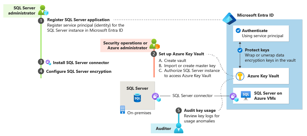 Met de SQL Server-connector voor Azure Key Vault kan SQL Server-versleuteling de Azure Key Vault-service gebruiken als een EKM-provider (Extensible Key Management) om SQL Server-versleutelingssleutels te beveiligen.