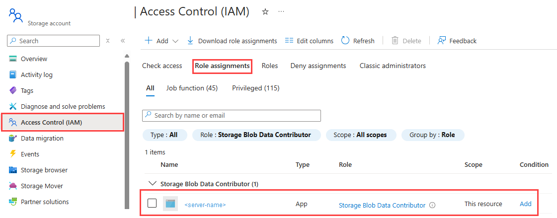 Storage Blob Data Contributorrol en controleer of de beheerde identiteit voor uw SQL Server-exemplaar wordt vermeld: