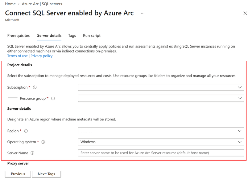 Als u een specifieke naam wilt gebruiken voor server met Azure Arc in plaats van de standaardhostnaam, kunnen gebruikers de naam voor Server met Azure Arc toevoegen in Servernaam.