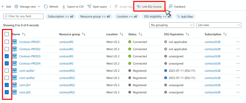 Volg deze stappen om een ESU-factuur te koppelen aan uw Azure Arc SQL Server-exemplaren om toegang te krijgen tot uitgebreide updates. Dit voorbeeld bevat zowel Connected als Registered-servers.