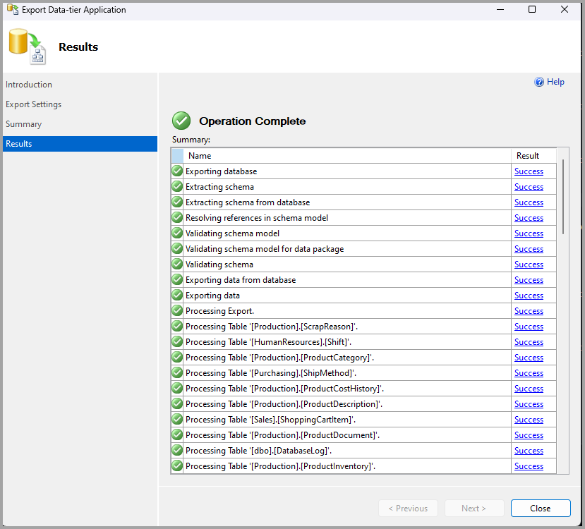 Het exportproces bouwt een .bacpac exportbestand in twee fasen.