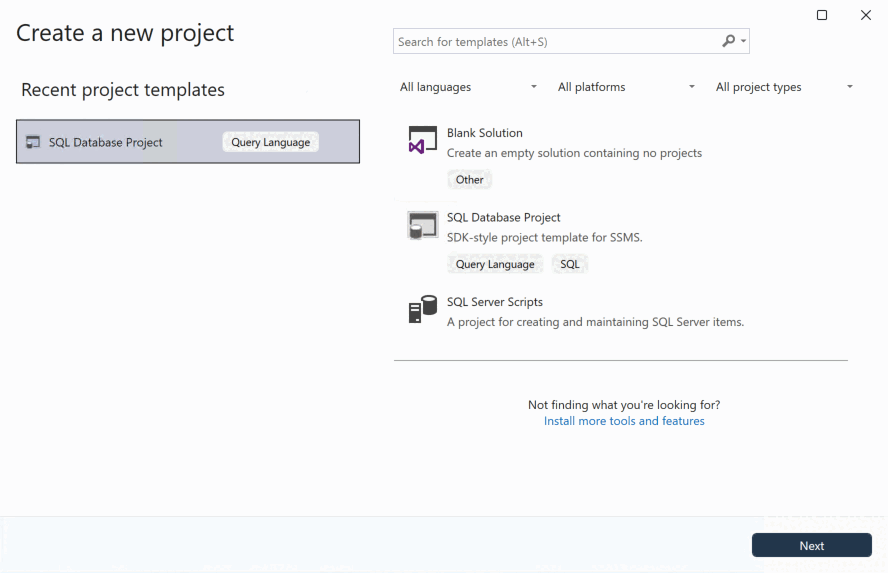 Gebruik in het dialoogvenster Nieuw Project de term SQL Server in het zoekvak. Het bovenste resultaat is SQL Server Database Project.
