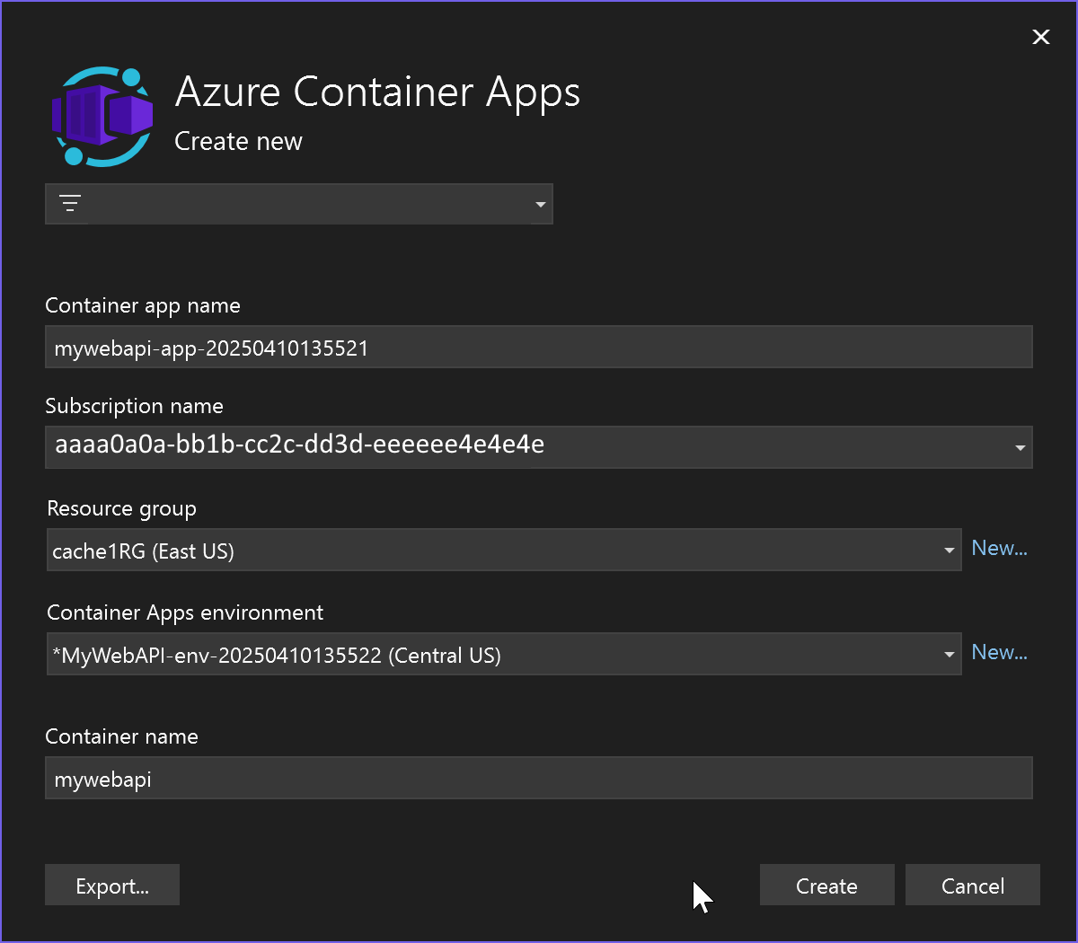 Kies in het scherm Nieuwe Azure-container-app maken dezelfde resourcegroep en dezelfde containeromgeving die u hebt gemaakt bij het publiceren van het web-API-project.