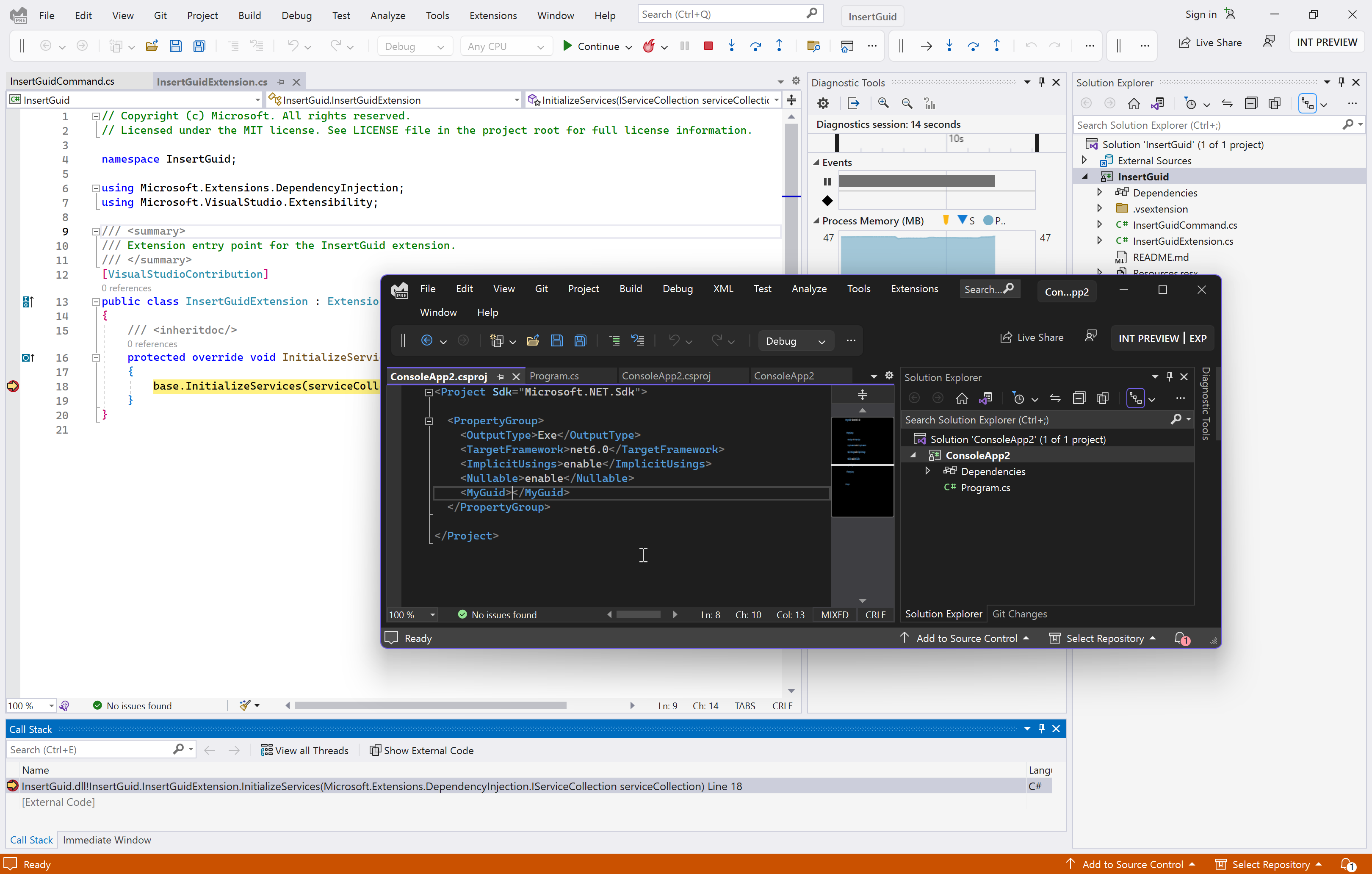 Wanneer u fouten in een Visual Studio-extensie opsbugt, wordt een speciaal exemplaar van Visual Studio met de naam Experimenteel exemplaar gebruikt om uw extensie te hosten terwijl u het foutopsporingsprogramma uitvoert in de hoofdversie van Visual Studio IDE. De twee instanties draaien onafhankelijk naast elkaar. In dit artikel wordt beschreven hoe u fouten kunt opsporen in extensies die zijn gemaakt met de VisualStudio.Extensibility SDK wanneer ze worden uitgevoerd in het experimentele exemplaar van de Visual Studio IDE.