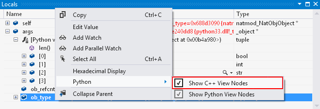 Als u de functie wilt inschakelen, klikt u met de rechtermuisknop in het venster Locals en stelt u de menuoptie Python>Show C++ View Nodes in.