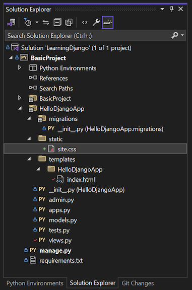 Visual Studio voegt het site.css-bestand toe aan het project en opent het bestand in de editor. Hier volgt een voorbeeld van de bijgewerkte Django-projectstructuur: