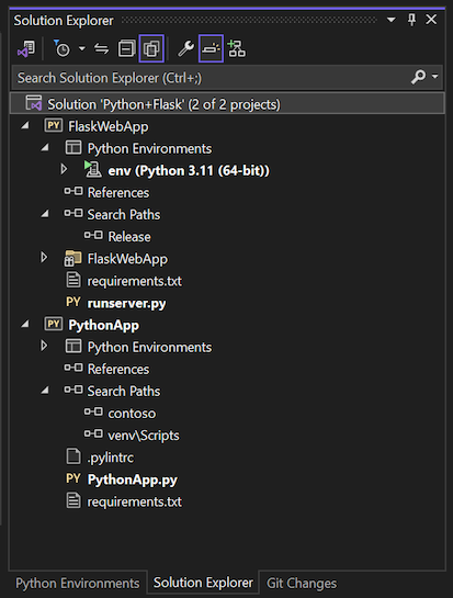 In de volgende afbeelding ziet u een voorbeeld van een Visual Studio-oplossing met zowel Python- als Flask-projecten in Solution Explorer-.