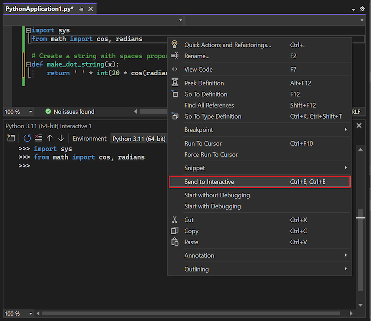 Visual Studio biedt verschillende manieren om bestaande Python-code te gebruiken in de Interactive Window, zoals kopiëren en plakken, en toegang te krijgen tot eerder ingevoerde code, zoals eerder beschreven. Een andere methode is het verzenden van meerdere regels code vanuit een editorvenster naar het Interactive Window. Met deze mogelijkheid kunt u code in een bronbestand onderhouden en eenvoudig de gekozen fragmenten verzenden naar het Interactive Window. U kunt vervolgens werken met de codefragmenten in de snelle REPL-omgeving in plaats van het hele programma uit te voeren.