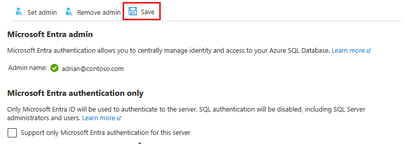 Na parte superior da página Microsoft Entra ID para o servidor lógico, selecione Save.