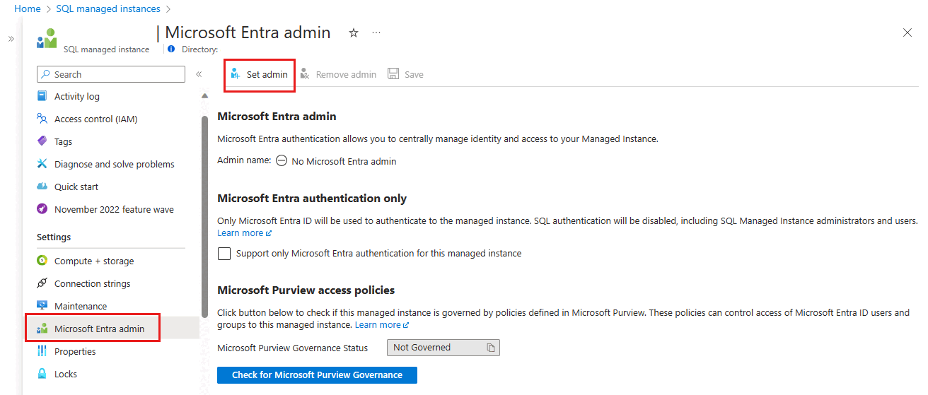 No painel Microsoft Entra administrador, selecione Set admin na barra de navegação para abrir o painel Microsoft Entra ID.