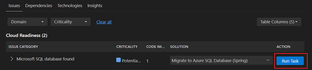Ao revisar o relatório de resumo, você pode selecionar Migrar para Banco de Dados SQL do Azure (Spring) na lista de soluções sob a questão Migração de Banco de Dados (Microsoft SQL). Em seguida, selecione Executar Tarefa para ir para o estágio de correção de código.