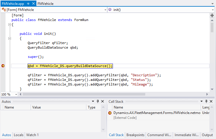 To debug X++ code, use the debugger in Microsoft Visual Studio. The process is similar to that for any other application created in Visual Studio. For example, when your code stops at a breakpoint, you can use the standard tools to examine the application.