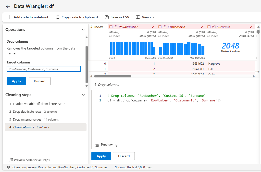 Selecione RowNumber, CustomerId, Sobrenome. Essas colunas aparecem em vermelho na versão prévia, para mostrar que são alteradas pelo código (nesse caso, descartadas).)