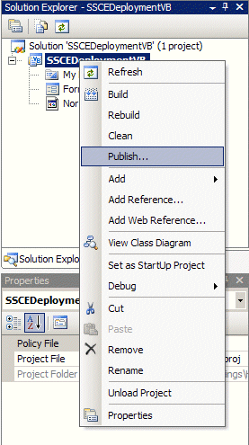 Figure 4. Selecting Publish on the SSCEDeploymentVB context menu