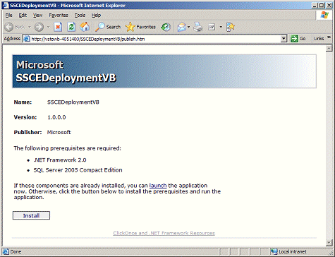 Notice that the application installation page that Visual Studio generates in this case is simpler than the application installation page from Exercise 1 of this tutorial. By converting the application to install SQL Server Compact Edition locally rather then installing SQL Server Compact Edition centrally, you have eliminated the need for application prerequisite installs; therefore, the application installation page need only provide a way to install the actual application.