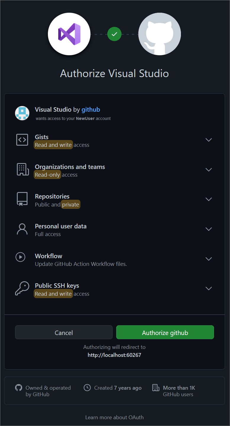 If you're signing in to GitHub from Visual Studio for the first time, an Authorize Visual Studio notice appears. Choose the options you want, and then select Authorize github.