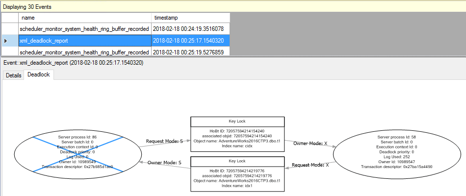 A sessão de eventos system_health captura xml_deadlock_report eventos por padrão. Esses eventos contêm o grafo de deadlock. Como a system_health sessão está habilitada por padrão, você não precisa configurar uma sessão de evento separada para capturar informações de deadlock.