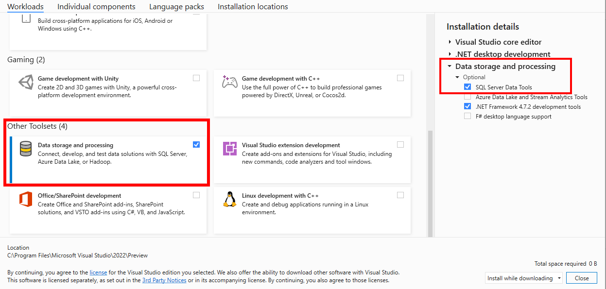 3. Selecione SQL Server Data Tools em Armazenamento e processamento de dados na lista de cargas de trabalho.