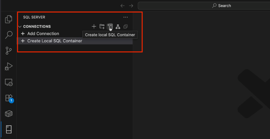 Na visão Conexões, selecione a opção Criar Contêiner SQL local no menu.