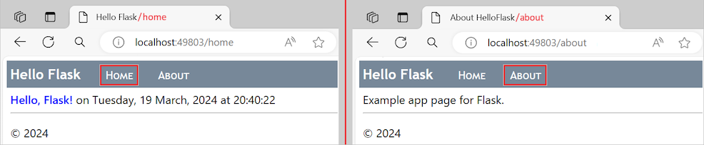 indexagora refere-se ao modelo base e substitui o bloco decontent. Você pode ver que, usando a herança, esse modelo é simplificado.Substitua o conteúdo do arquivo HelloFlask/templates/about.html pela seguinte marcação, de modo que o modelo de
