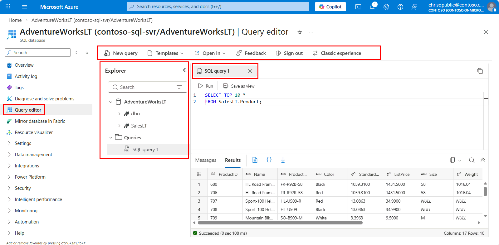 Uma vez ligado à experiência do editor de consultas, pode usar o Explorador para visualizar objetos da base de dados ou a janela de Consulta para executar consultas T-SQL.
