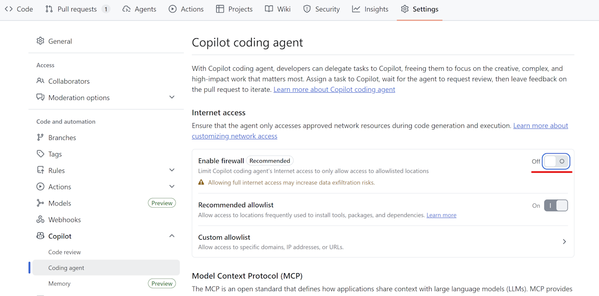 Desative o firewall integrado do agente de codificação do Copilot nas definições do seu repositório, como mostrado na imagem seguinte: