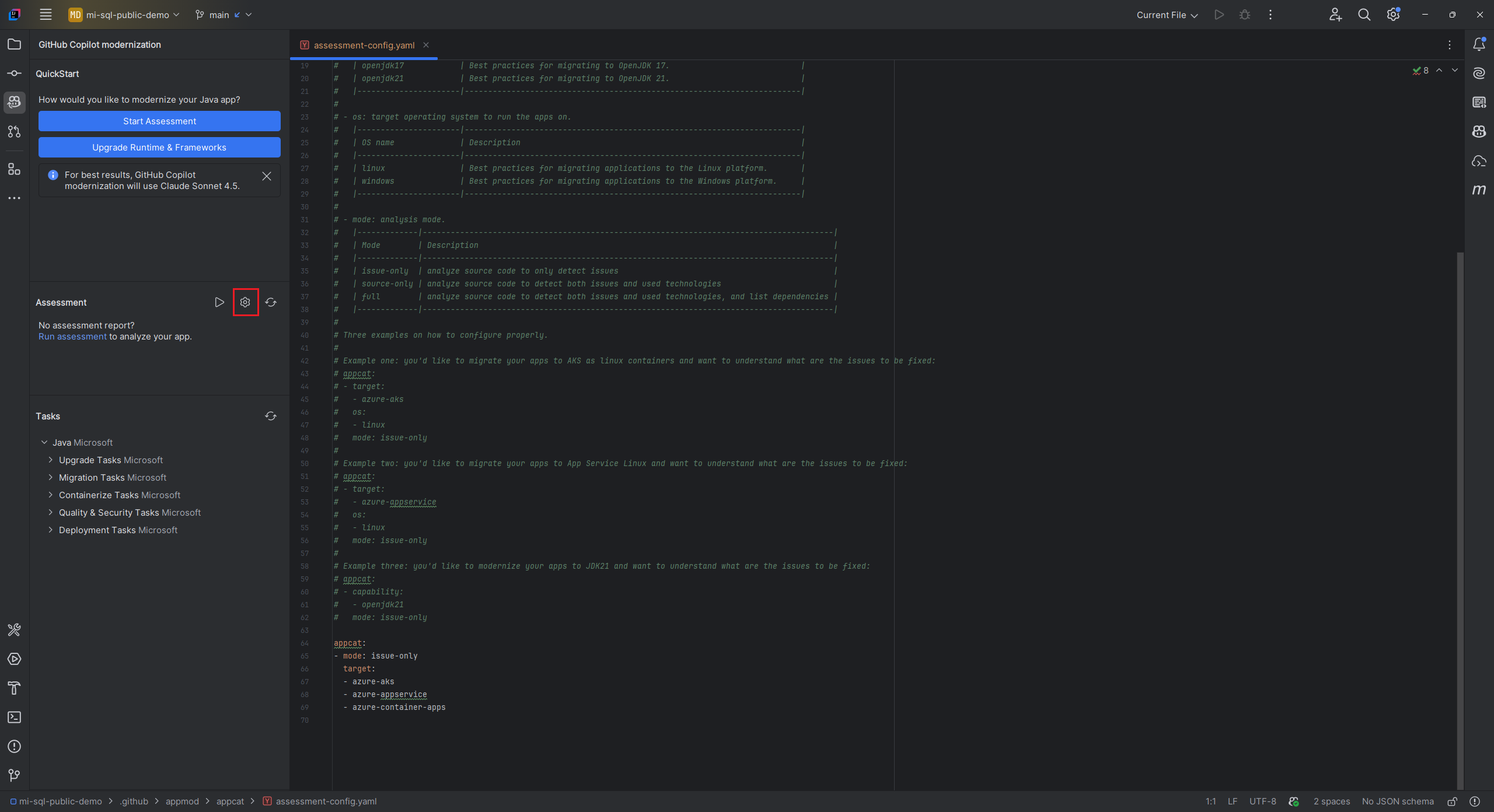 target: o serviço de computação Azure para executar as aplicações. Escolhe vários alvos se ainda não decidires qual usar. Depois, pode comparar os objetivos no relatório de avaliação.Valor Description azure-aksPráticas recomendadas para implantar um aplicativo no Serviço Kubernetes do Azure. azure-appservicePráticas recomendadas para implantar um aplicativo no Serviço de Aplicativo do Azure. azure-container-appsPráticas recomendadas para implantar um aplicativo em Aplicativos de Contêiner do Azure. capability: a tecnologia alvo para modernizar as aplicações.Valor Description containerizationPráticas recomendadas para aplicativos de conteinerização. openjdk11Práticas recomendadas para migrar para o OpenJDK 11. openjdk17Práticas recomendadas para migrar para o OpenJDK 17. openjdk21Práticas recomendadas para migrar para o OpenJDK 21. os: o sistema operativo alvo para executar as aplicações.Valor Description linuxPráticas recomendadas para migrar aplicativos para a plataforma Linux. windowsPráticas recomendadas para migrar aplicativos para a plataforma Windows. mode: o modo de análise.Valor Description issue-onlyAnalisa o código-fonte para detetar apenas problemas. source-onlyAnalisar o código-fonte para detetar tanto problemas como tecnologias usadas. fullAnalisar o código-fonte para detetar tanto problemas como tecnologias usadas, e listar dependências.