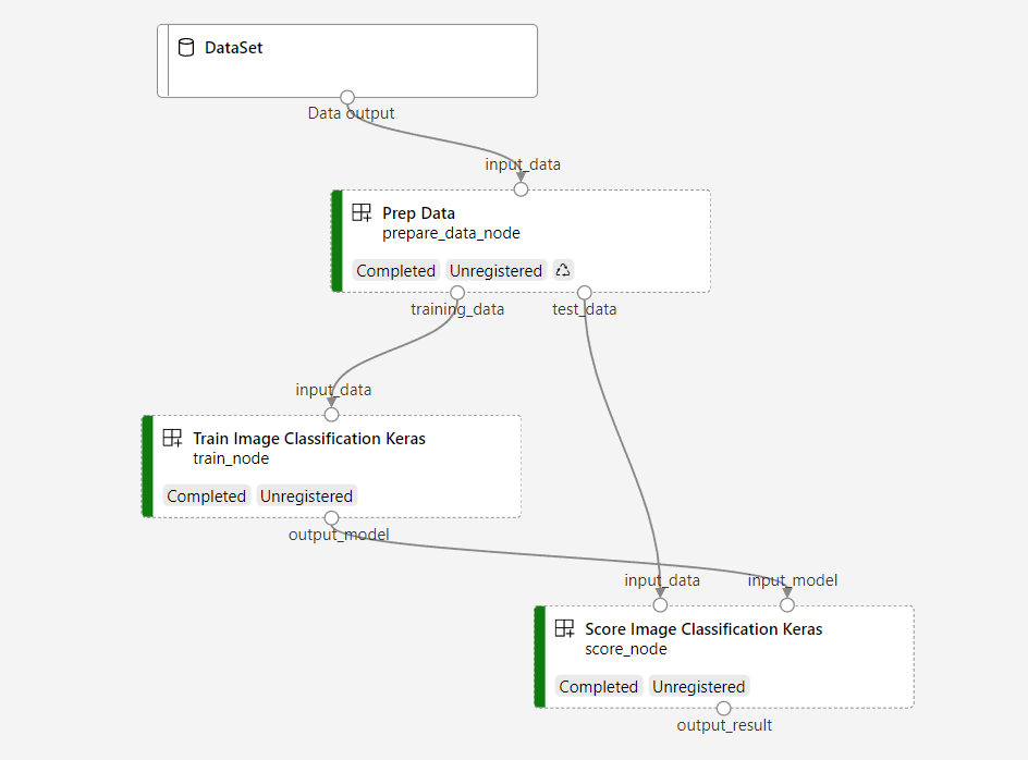 O pipeline contém três etapas: preparar dados, treinar um modelo de classificação de imagem e pontuar o modelo. O exemplo de pipeline treina uma rede neuronal convolucional pequena Keras para classificar imagens no conjunto de dados Fashion MNIST. O pipeline tem esta aparência: