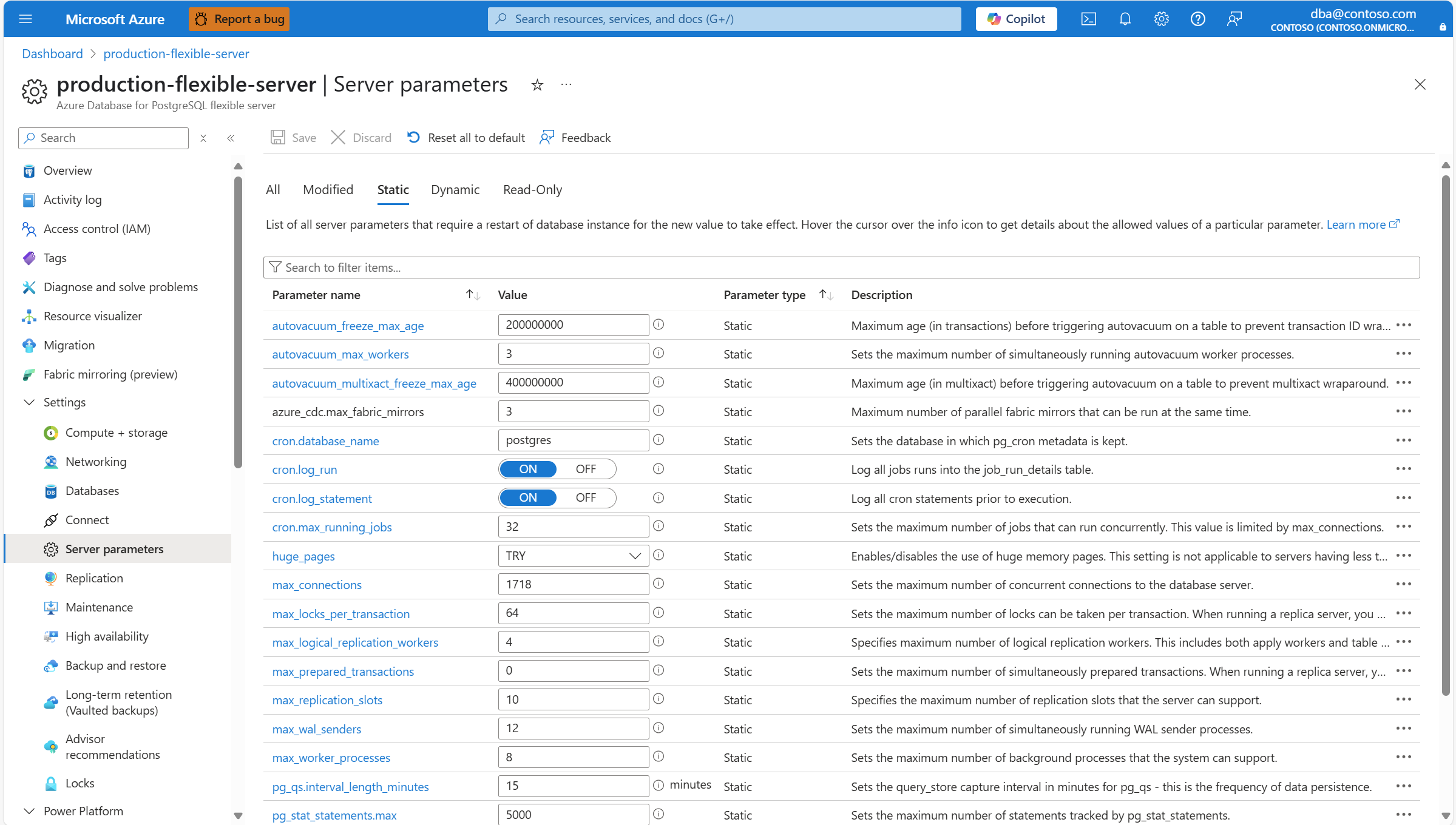 Este artigo fornece instruções passo a passo para listar parâmetros de servidor estático de leitura/gravação de um banco de dados do Azure para servidor flexível PostgreSQL.