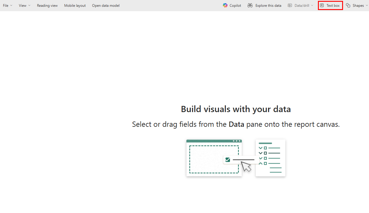 Depois de concluir todas as operações descritas anteriormente, selecione Criar novo relatório na faixa de opções superior Lista de opções Arquivo para abrir a página de criação de relatórios do Power BI, conforme mostrado na captura de tela a seguir: