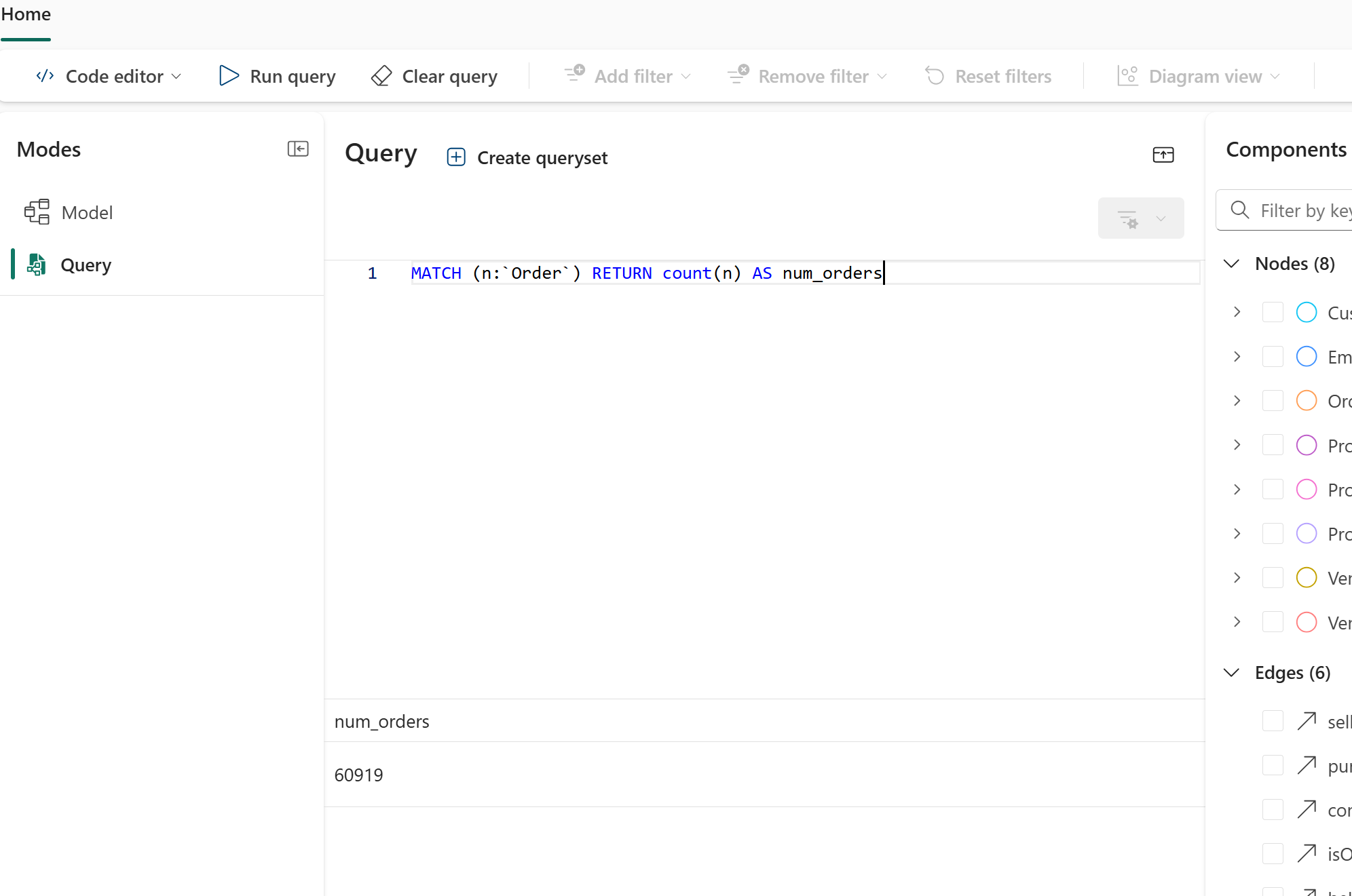 Esta consulta encontra todos os nós com a etiqueta Order, conta-os e retorna o total como num_orders. É uma forma simples de confirmar que o teu gráfico tem dados e que a contagem corresponde ao número de linhas de ordem que carregaste. A imagem seguinte mostra o resultado da consulta: