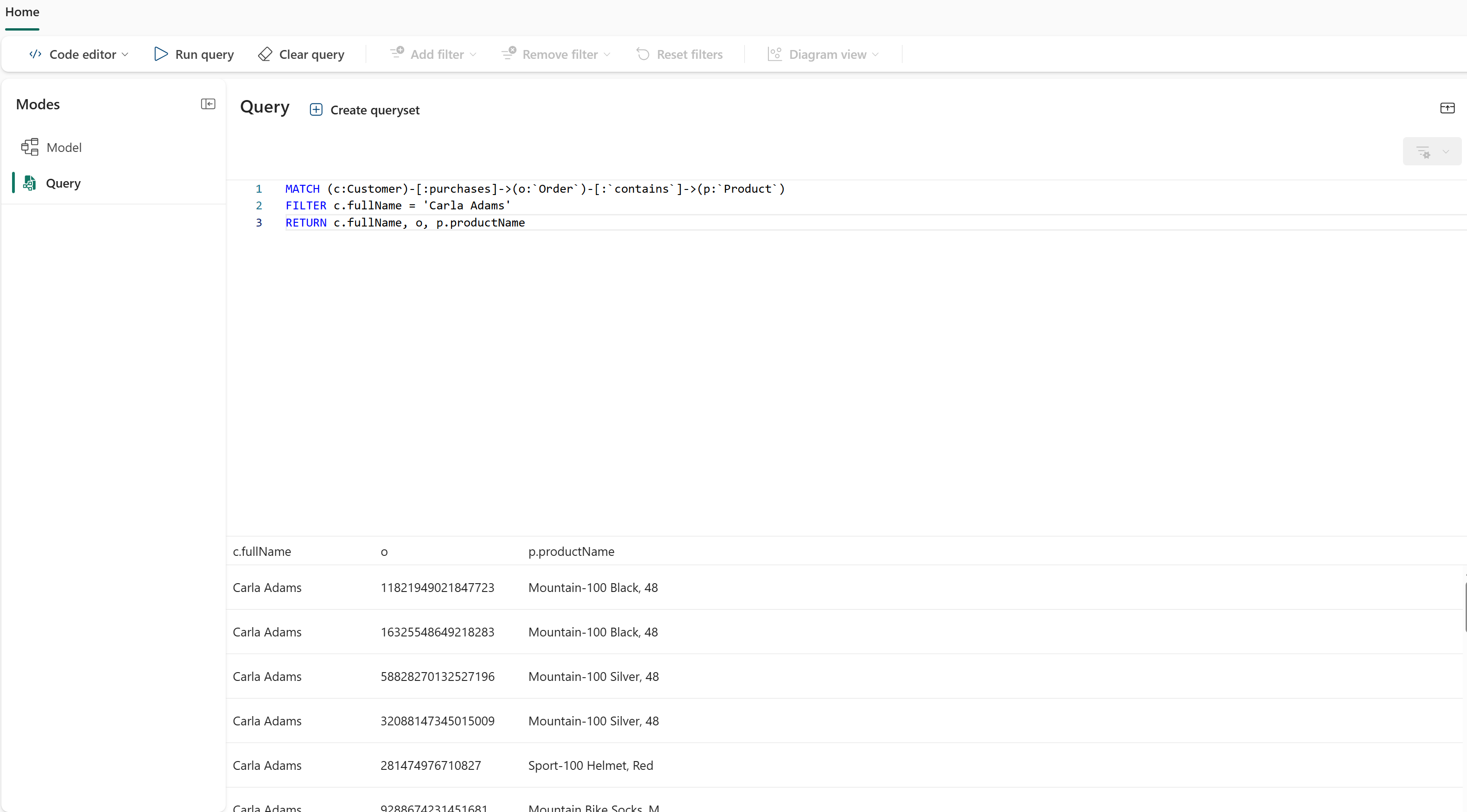 No passo anterior do tutorial, usaste o construtor de consultas para encontrar que produtos um cliente específico comprou. Aqui está a mesma consulta escrita em GQL: