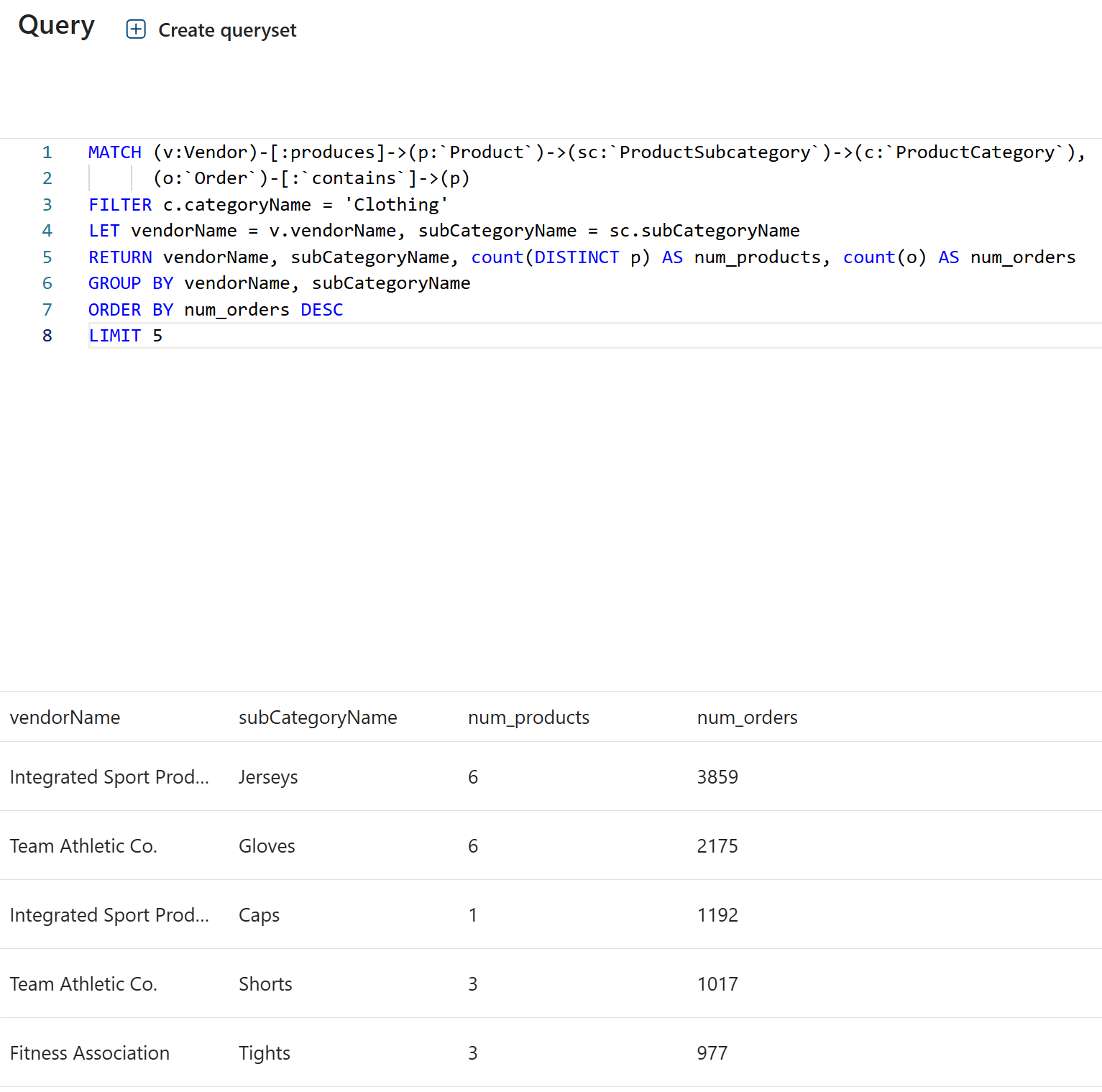 Pode executar consultas mais complexas que combinam padrões de grafos correspondentes, filtragem, agregação, ordenação e limitação: