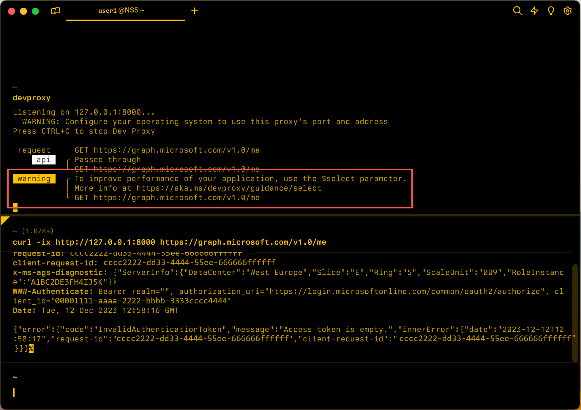 Mostra um aviso quando o proxy interceta uma solicitação para APIs do Microsoft Graph que não inclui o parâmetro de cadeia de caracteres de consulta $select.
