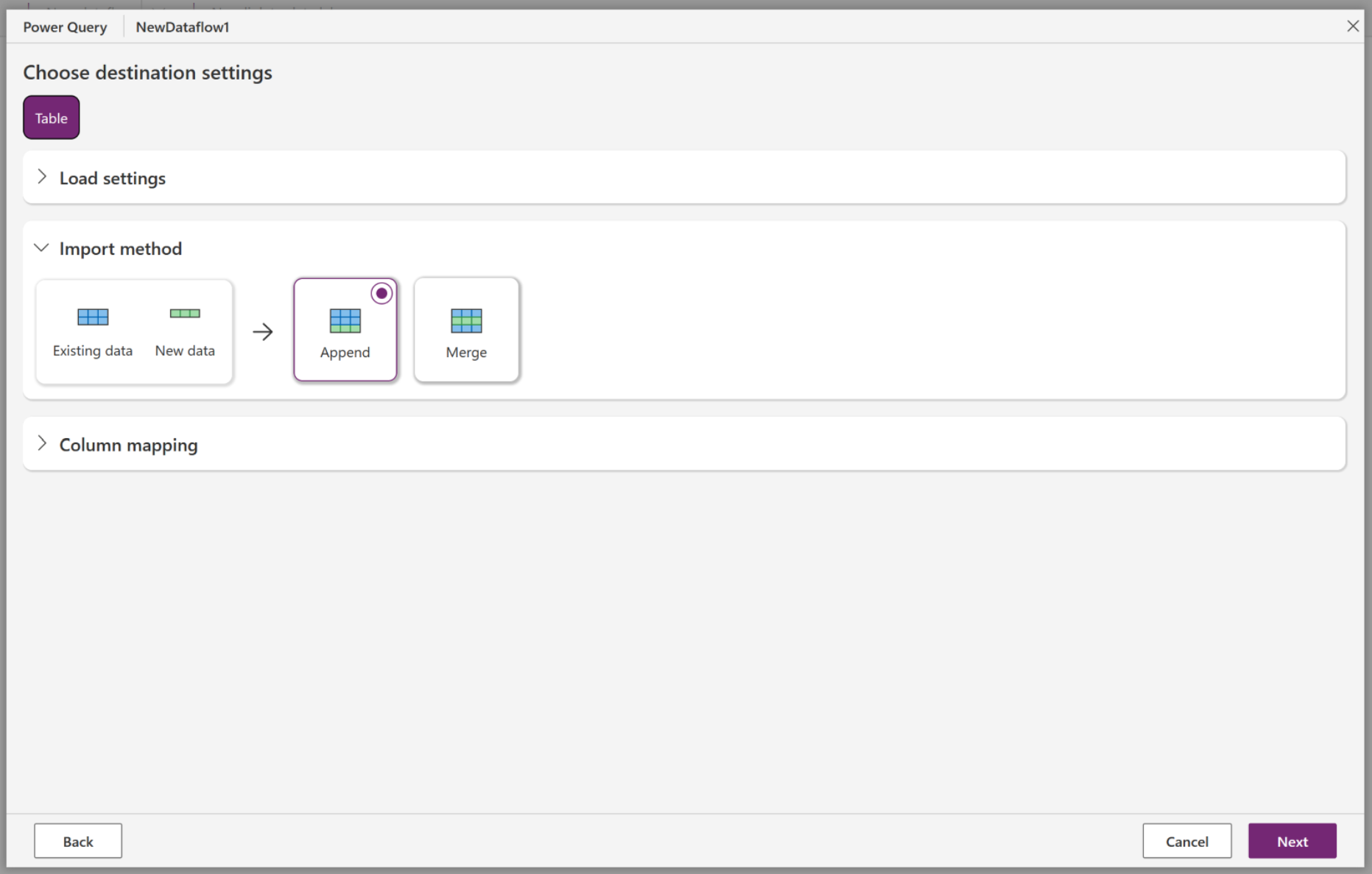 Em Configurações de carregamento, selecione Carregar para nova tabela.