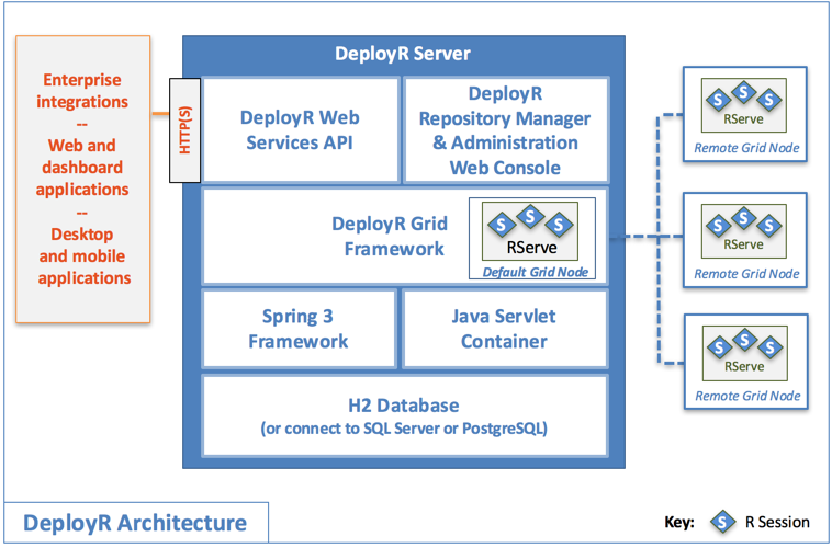 The DeployR API exposes the R platform as a service allowing the integration of R statistics, analytics, and visualizations inside Web, desktop and mobile applications. This API is exposed by the DeployR server, a standards-based server technology capable of scaling to meet the needs of enterprise-grade deployments.