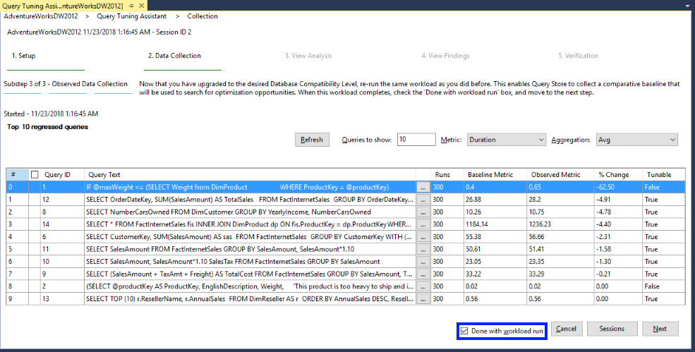 A Coleta de Dados Observados solicita que o usuário execute o ciclo de carga de trabalho representativo novamente, para que o Repositório de Consultas possa coletar uma linha de base comparativa usada para procurar oportunidades de otimização. À medida que a carga de trabalho é executada, use o botão Atualizar para continuar atualizando a lista de consultas regredidas, se alguma for encontrada. Altere o valor de Consultas a mostrar para limitar o número de consultas exibidas. A ordem da lista é afetada pelo Métrico (Duração ou CpuTime) e pela Agregação (A média é o padrão). Selecione também quantas Consultas mostrar. Quando essa carga de trabalho for concluída, marque a opção Concluído com a execução da carga de trabalho e selecione Avançar.