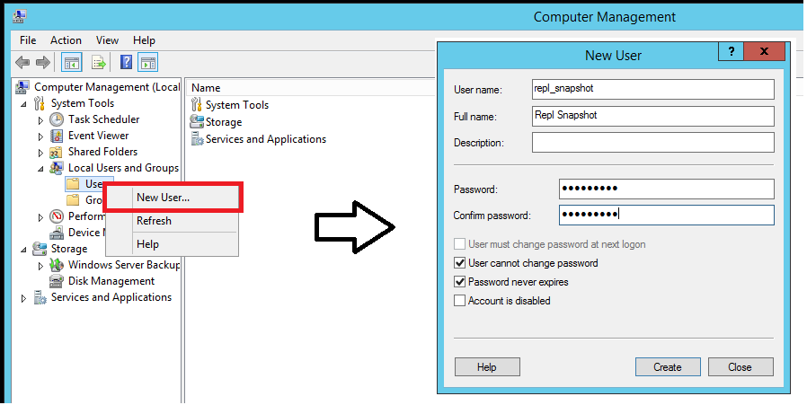 4. Introduza repl_snapshot na caixa de nome de utilizador , forneça a palavra-passe e outras informações relevantes, e depois selecione Criar para criar a conta repl_snapshot: