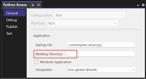 .). Note que o Ficheiro de Arranque não tem uma localização específica na pasta.O código do programa clonado procura um ficheiro chamado koans.txt no diretório de trabalho. O código espera que o diretório seja a localização da pasta onde instruiu o Visual Studio a armazenar os ficheiros do repositório clonados. Se deixar o Diretório de Trabalho definido na raiz do projeto (