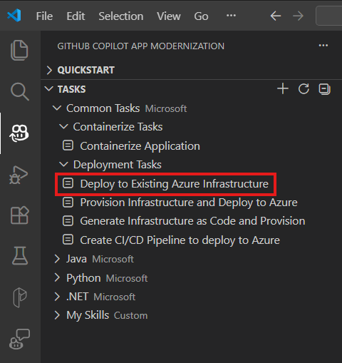 I avsnittet Uppgifter öppnar du Distributionsuppgifter och väljer Distribuera till befintlig Azure-infrastruktur.
