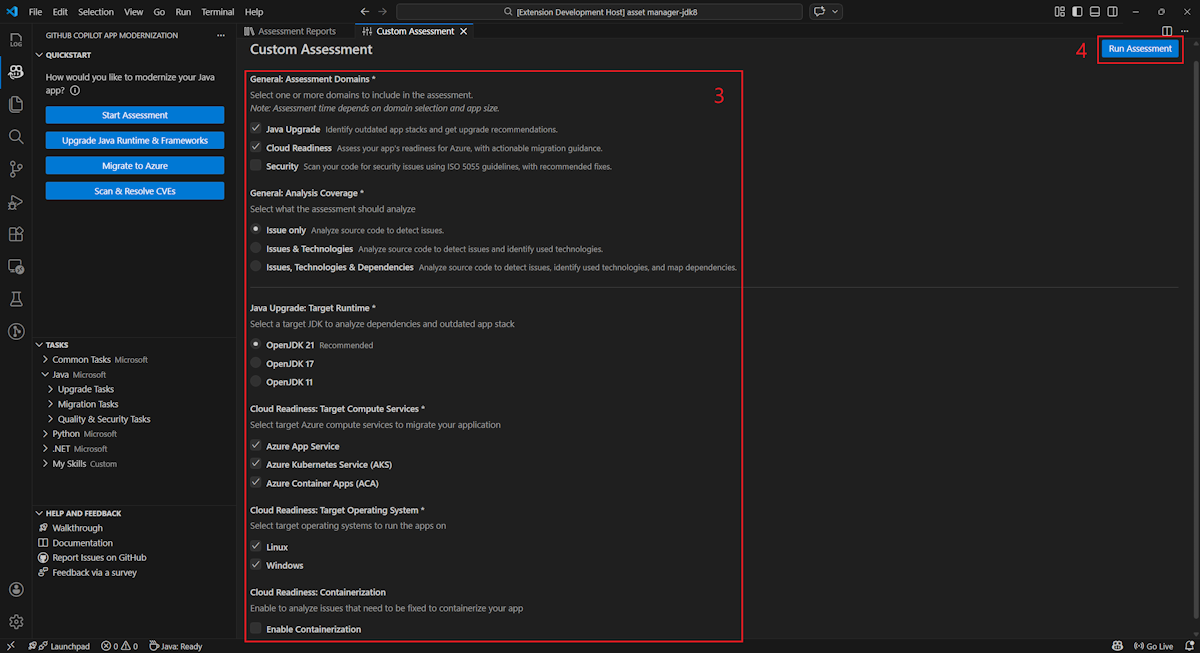 target: Den Azure-beräkningstjänst som apparna ska köras på. Välj flera mål om du inte har bestämt vilken som ska användas. Du kan sedan jämföra målen i utvärderingsrapporten.Värde Description azure-aksMetodtips för att distribuera en app till Azure Kubernetes Service. azure-appserviceMetodtips för att distribuera en app till Azure App Service. azure-container-appsMetodtips för att distribuera en app till Azure Container Apps. capability: måltekniken för att modernisera apparna mot.Värde Description containerizationMetodtips för containerisering av program. openjdk11Metodtips för migrering till OpenJDK 11. openjdk17Metodtips för migrering till OpenJDK 17. openjdk21Metodtips för migrering till OpenJDK 21. os: det måloperativsystem som apparna ska köras på.Värde Description linuxMetodtips för att migrera program till Linux-plattformen. windowsMetodtips för att migrera program till Windows-plattformen. mode: analysläget.Värde Description issue-onlyAnalysera källkod för att endast identifiera problem. source-onlyAnalysera källkod för att identifiera både problem och tekniker som används. fullAnalysera källkoden för att identifiera både problem och tekniker som används samt lista beroenden.